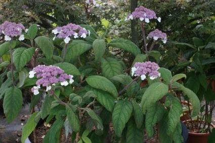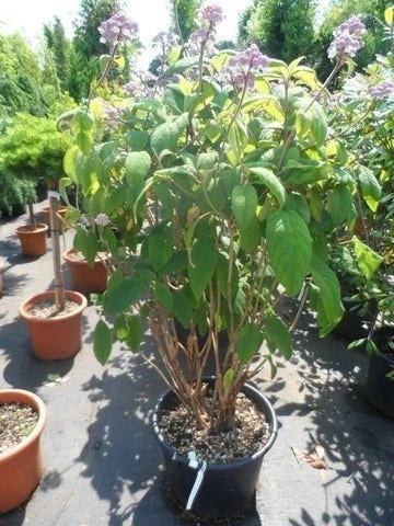 De bloemschermen zijn ook zeer groot, de bloemen zijn paars van kleur met witte randbloemen.