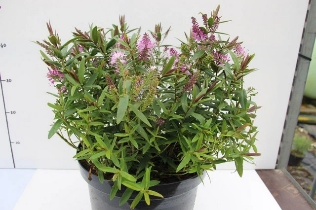 Hebe ‘Wiri Joy’ heeft groene bladeren. De plant wordt maximaal 75cm hoog en is breed groeiend. Bloeiend met trossen roze bloemen.