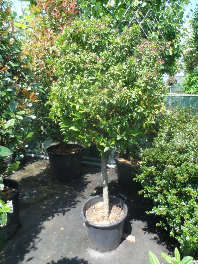 Viburnum tinus ‘Eve Price’ (groenblijvende sneeuwbal) is een populaire wintergroene heester met lange bloei. Vaak al vanaf oktober tot maart-april. Deze Viburnum tinus is gekweekt op stam.Â