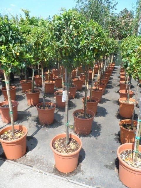 Het gaat hier om de Viburnum tinus ‘Eve Price’ op stam. De vermelde maten zijn stamhoogtes.